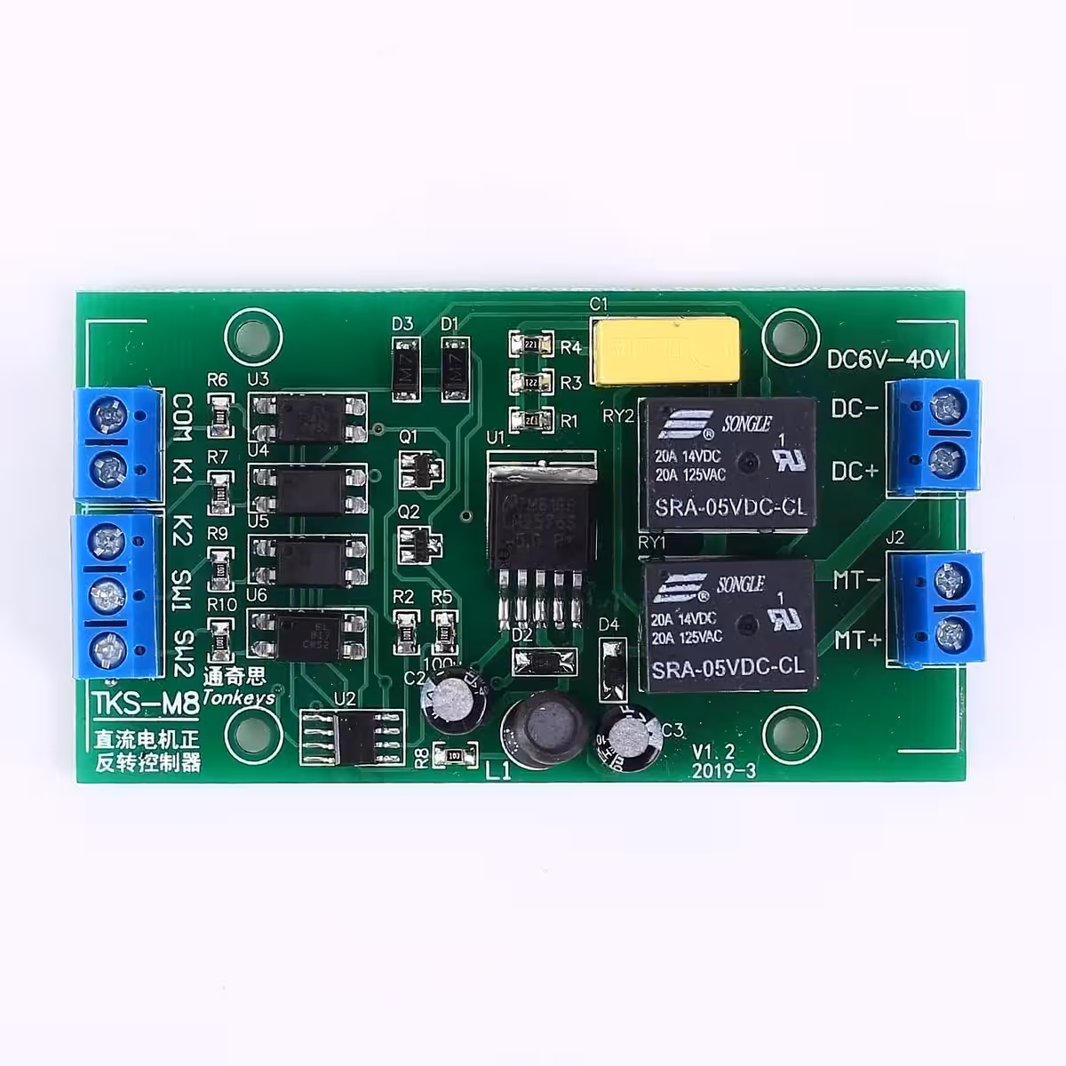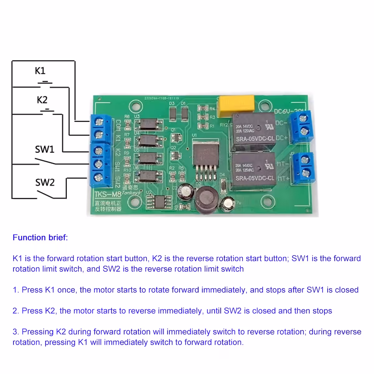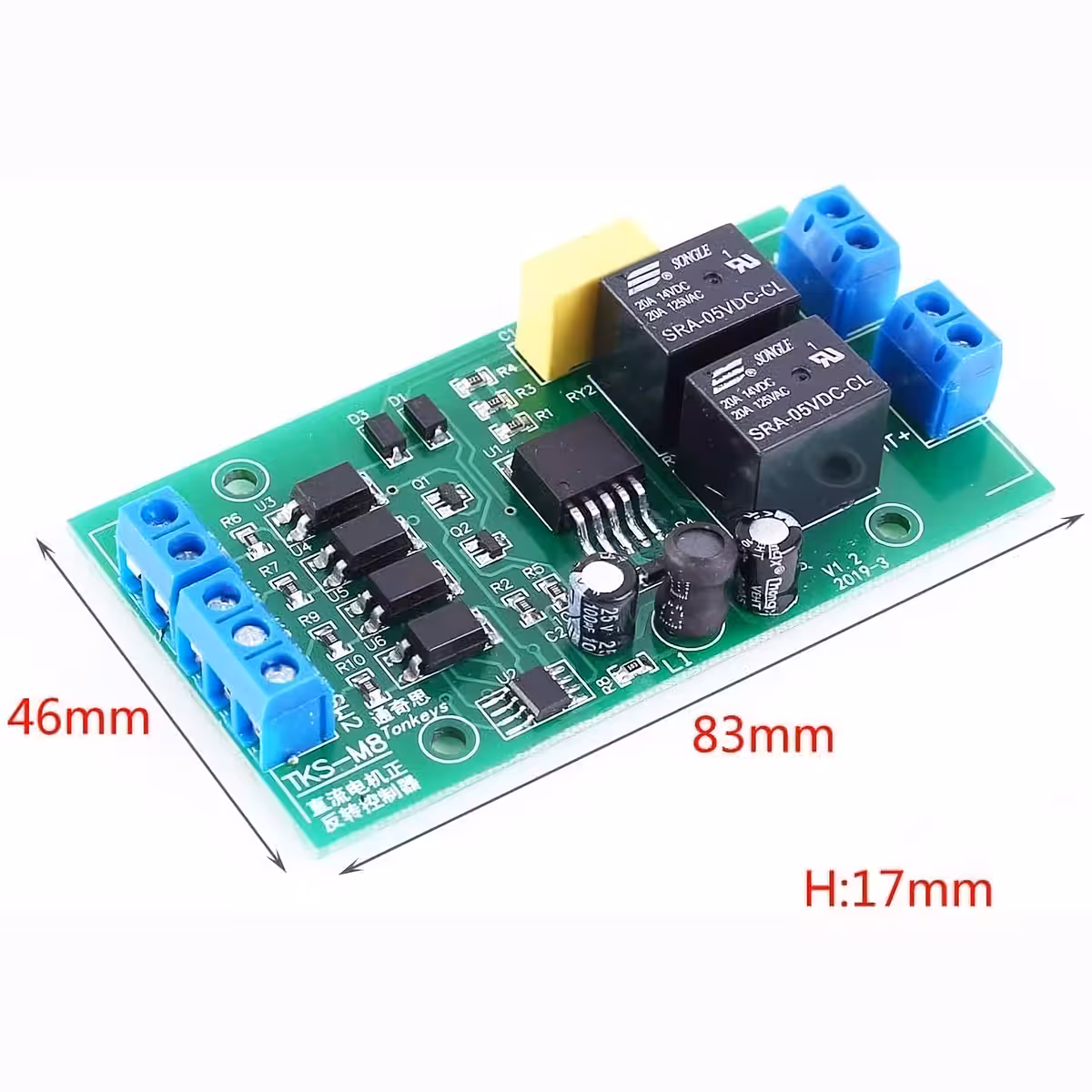 Компактен модул за управление на посоката на DC мотори, идеален за системи с ограничители на хода, задвижващи механизми, линейни механизми или DIY проекти, където са нужни функции за движение напред и назад. Работи в много широк диапазон на напрежение между 4V и 40V, като за стабилна работа се препоръчва 6V–36V. Свързаният мотор получава същото напрежение като захранването на модула.