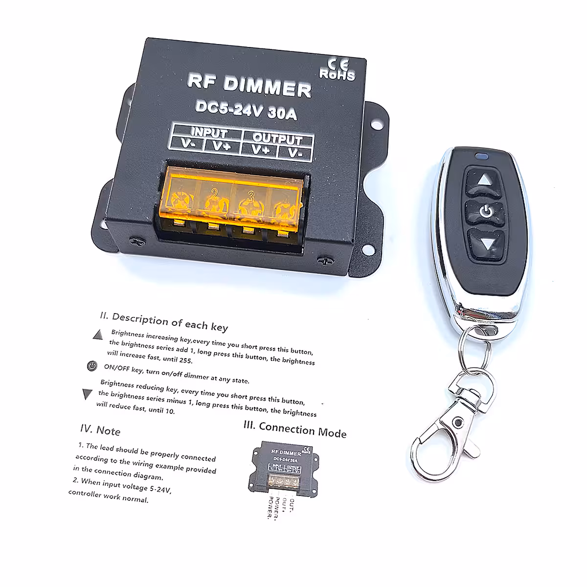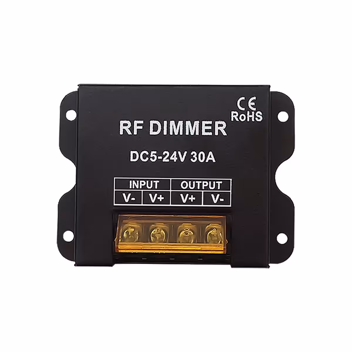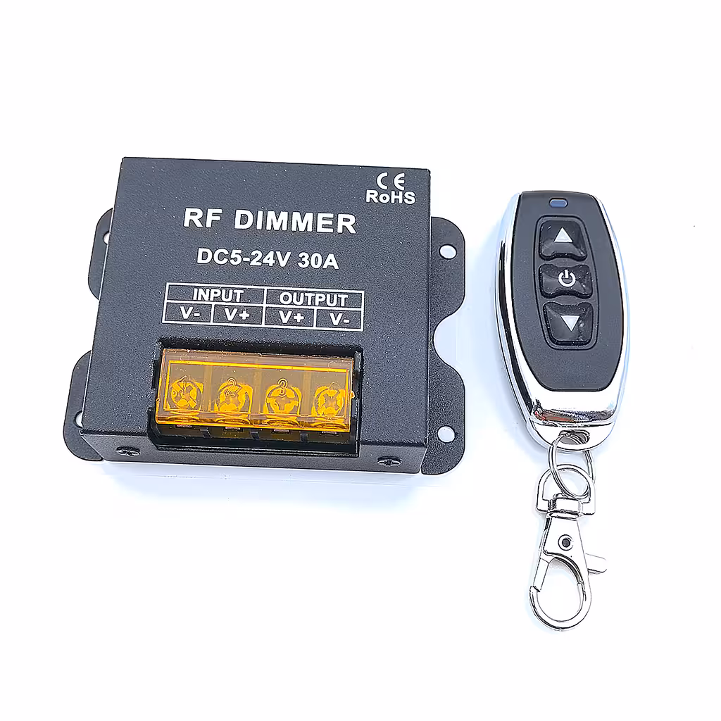 Този диммер за LED ленти, съвместим с напрежения 12V и 24V, е DC контролер 5-24V, 30A, снабден с безжично RF дистанционно с 3 бутона.