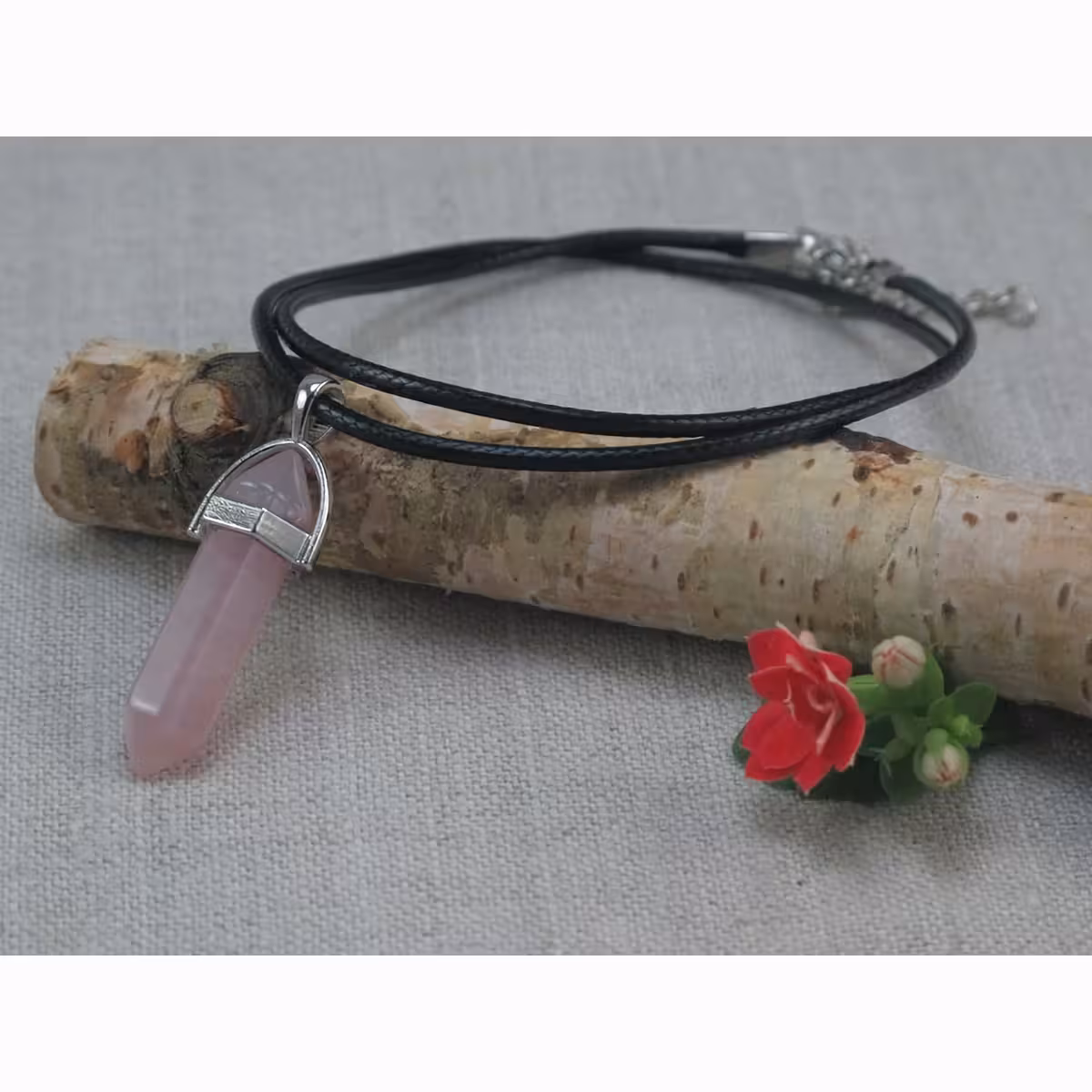 Офертата включва: медальон от розов кварц и кожена верижка, елегантна и издръжлива, с карабинерна закопчалка.