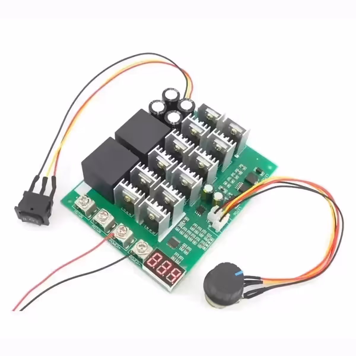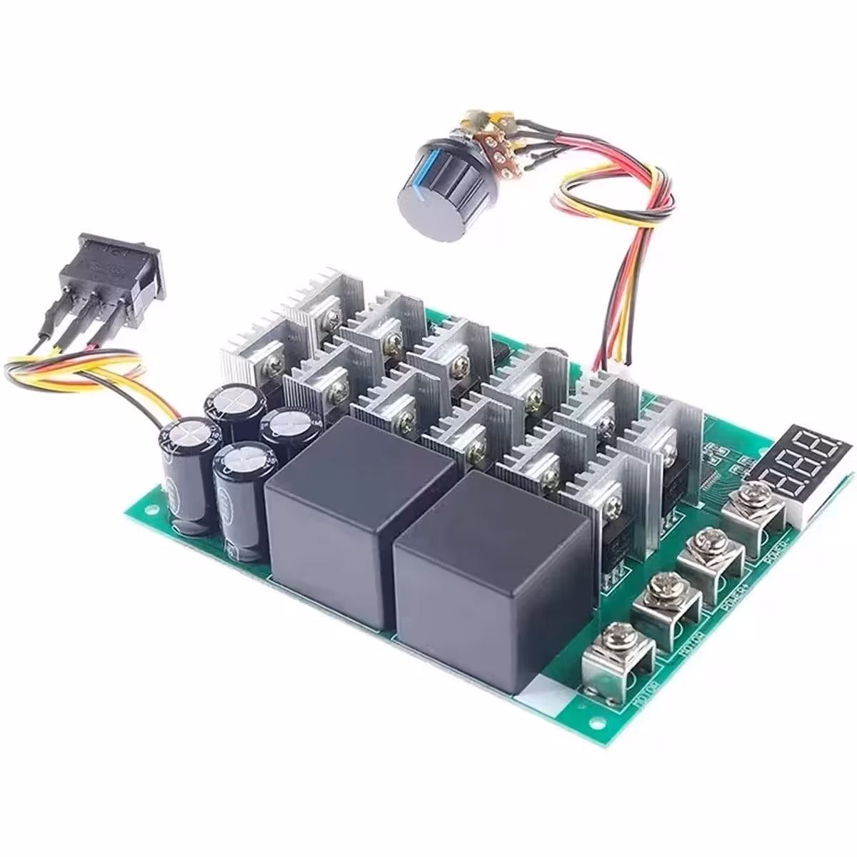 Професионален PWM контролер за управление на оборотите на електрически мотори с постоянно напрежение (DC), идеален за приложения с висока мощност. Осигурява прецизно регулиране на скоростта чрез потенциометър, функция за обръщане на посоката на въртене и цифров дисплей на оборотите (0–100%). Съвместим с входно напрежение от 10V до 55V и ток до 100A (60A непрекъснато).