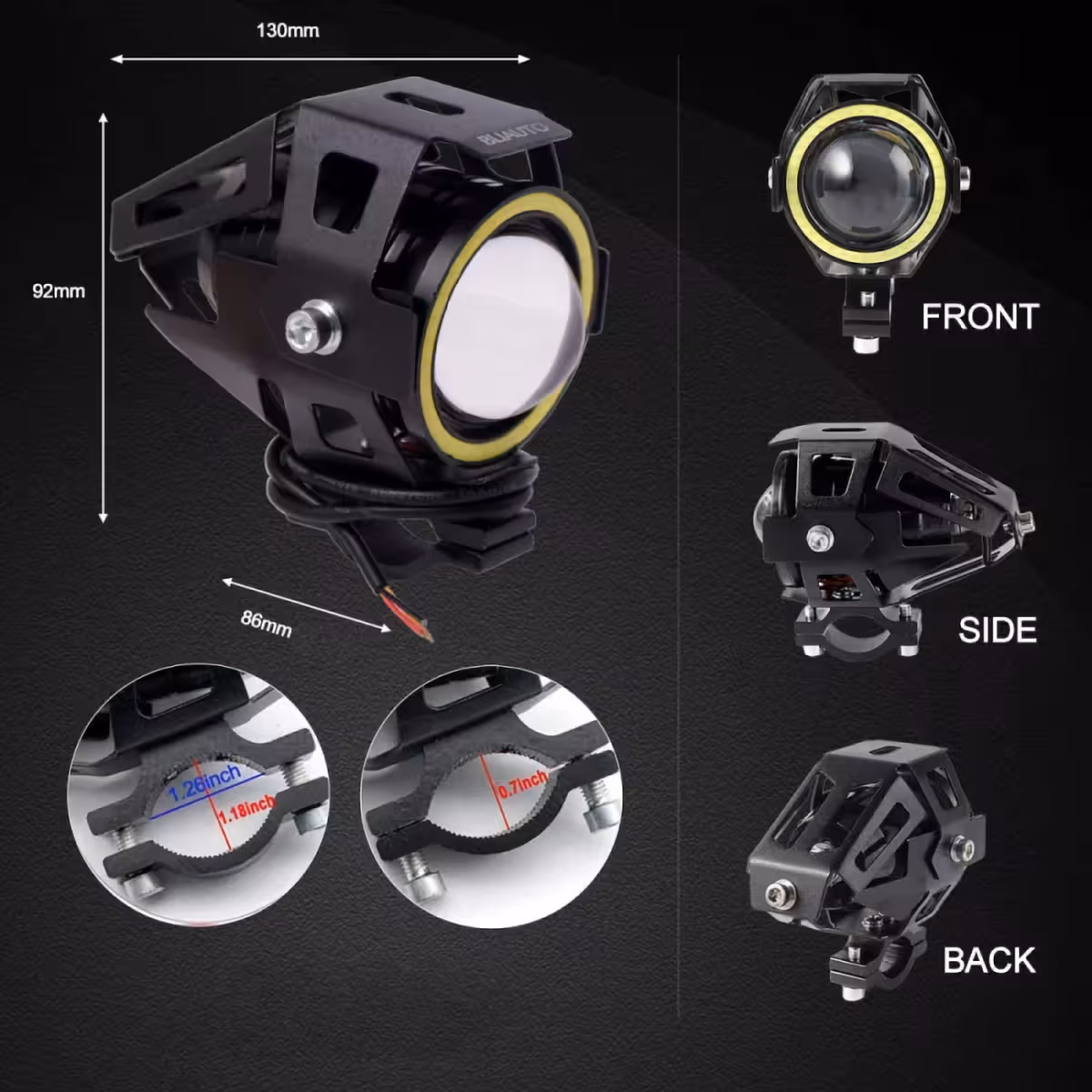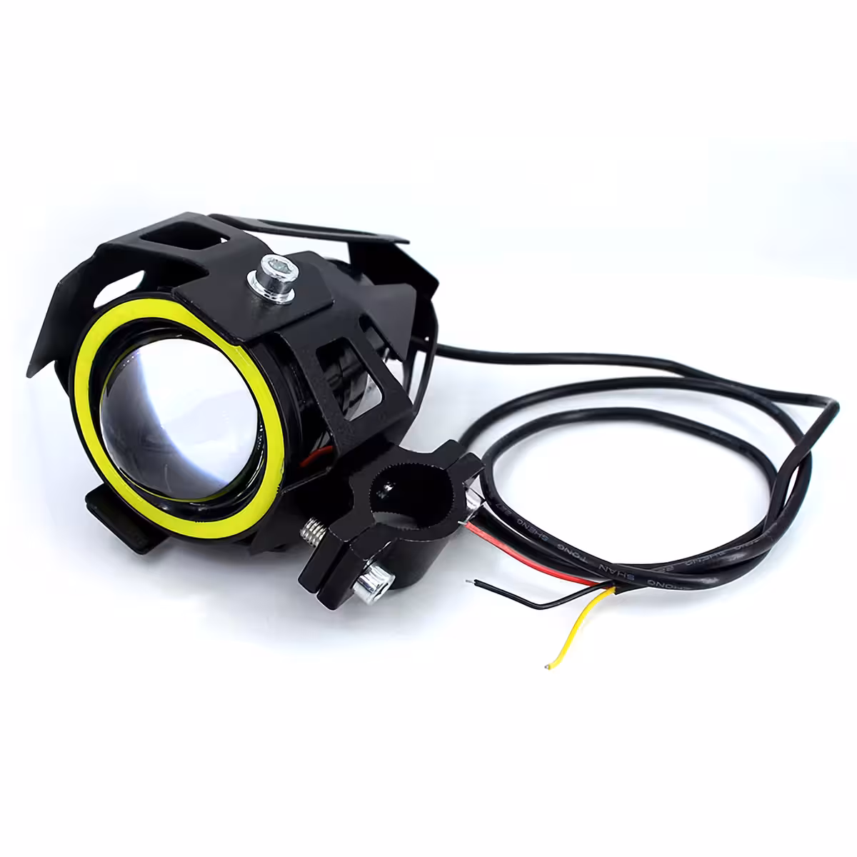 LED прожектор тип U7 с Angel Eyes, идеален за използване на мотоциклет, ATV, електрически велосипед, скутер или офроуд автомобили. Този допълнителен LED фар предлага отлична видимост и агресивен стил, като е перфектен избор за тъмни пътища и трудни условия.