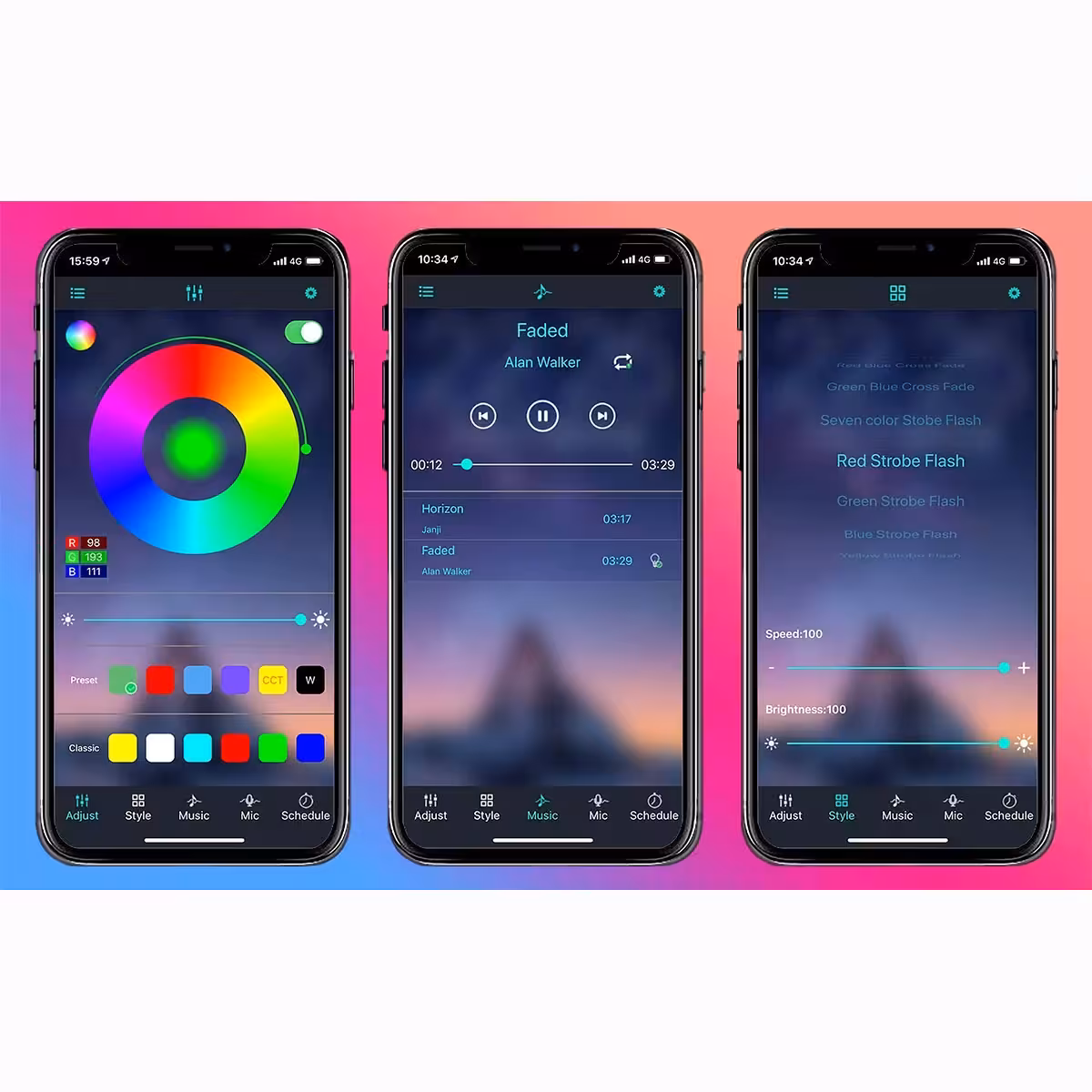 - Настройка на фиксиран цвят и музикален режим, който реагира на звук