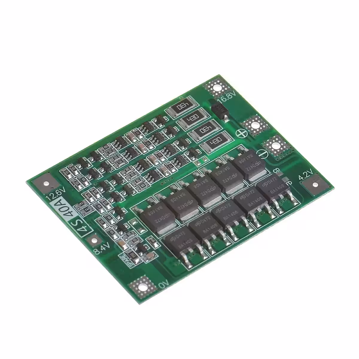 Модул BMS 4S 40A осигурява пълна защита на пакети батерии Li-Ion 18650, съставени от 4 клетки в серия (14.8V). Идеален е за приложения като: бормашини, електрически отвертки, дронове, роботизирани прахосмукачки, RC колички или други устройства, захранвани с 14.8V батерии.