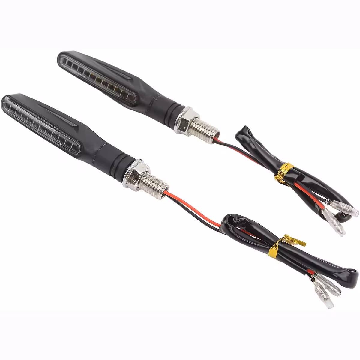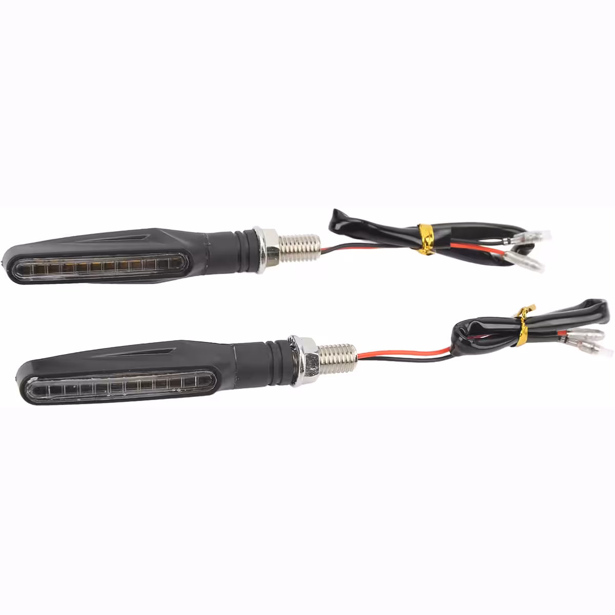 Универсален комплект динамични LED мигачи за мотоциклет с последователен ефект, съвместим с мотоциклети, скутери и ATV. Модерният дизайн с изчистени ръбове и плавни линии предлага елегантен външен вид, а LED технологията осигурява ниска консумация на енергия и силна яркост за максимална видимост.