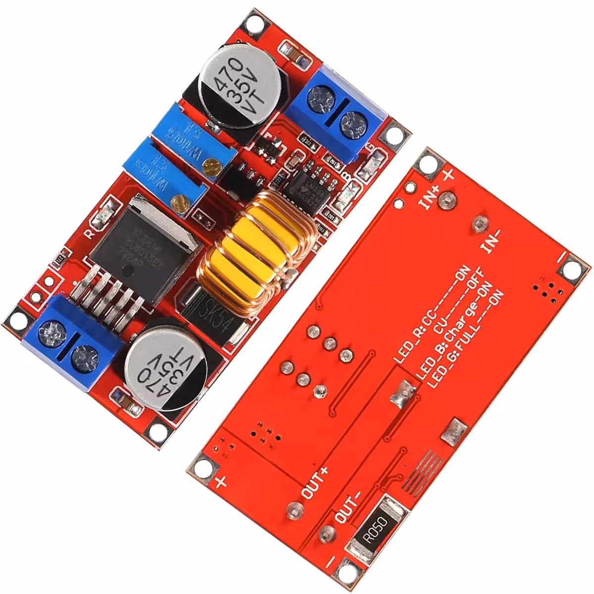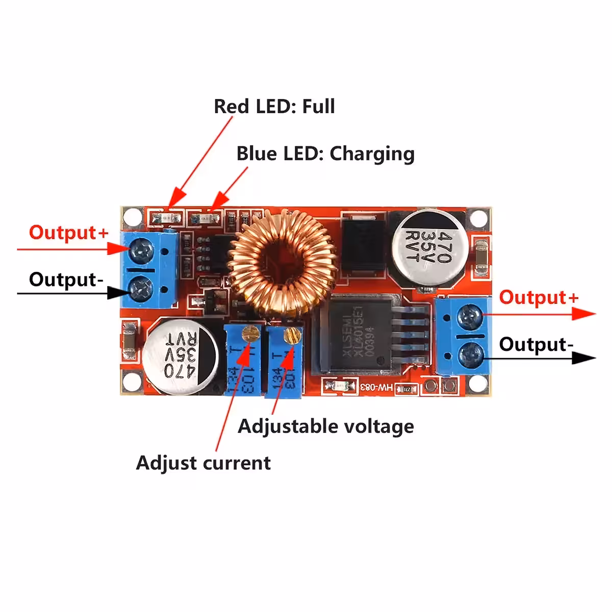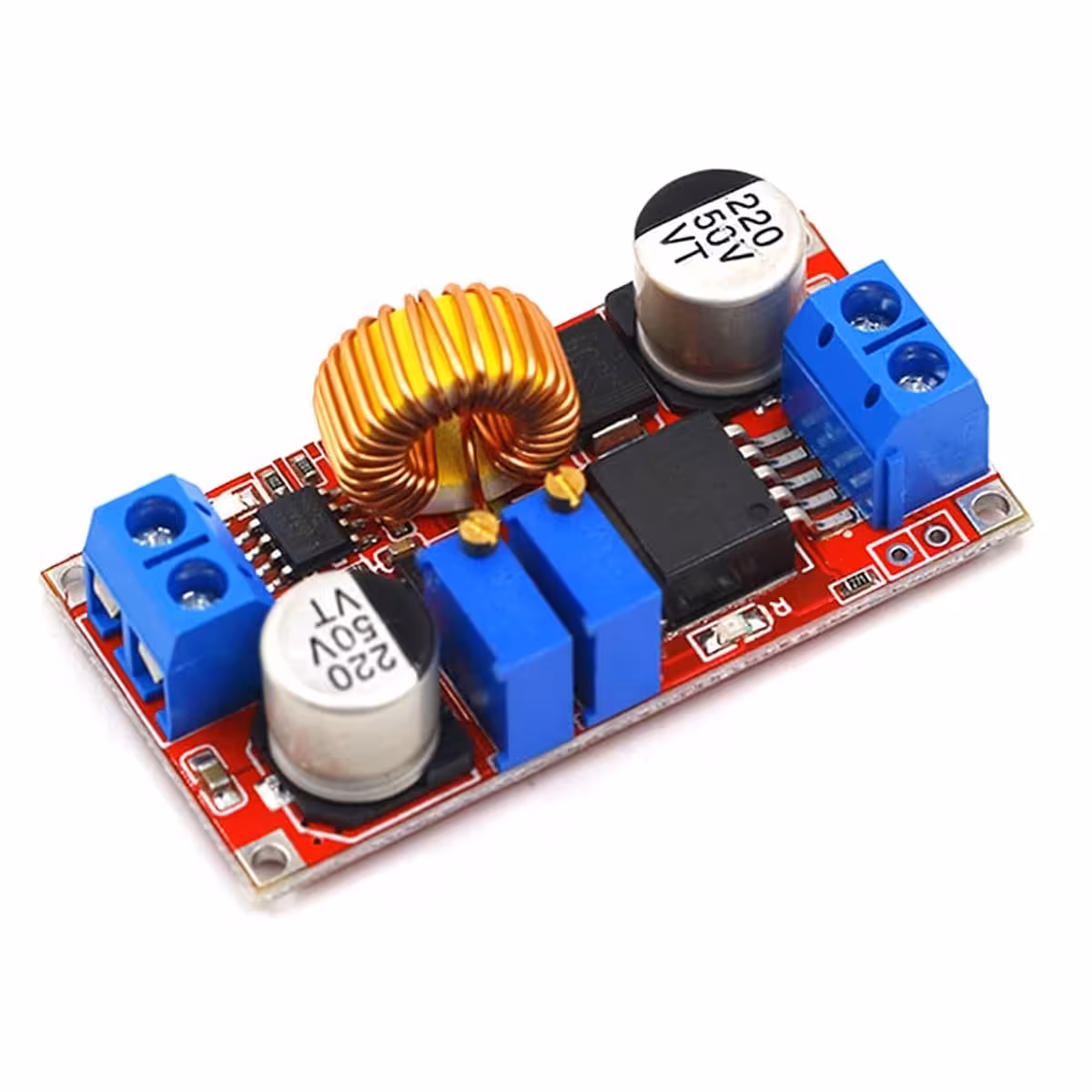 Модулът XL4015 е високоефективен DC-DC понижаващ преобразувател с регулируемо изходно напрежение между 1.25V и 36V и ток до 5A (препоръчително макс. 4.5A за дълготрайност). Поддържа настройка на напрежението (CV) и тока (CC), идеален за зареждане на батерии или захранване на LED ленти.