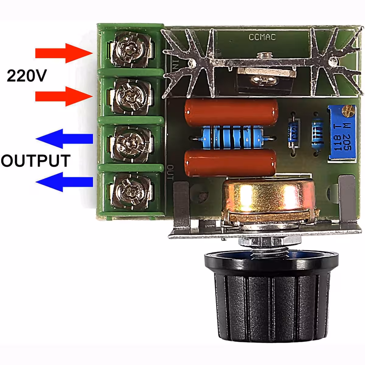 Този регулатор на обороти AC е съвместим с универсални и индуктивни електрически мотори и може да се използва за вентилатори, помпи, електрически радиатори или друго оборудване, работещо на променлив ток 220V.